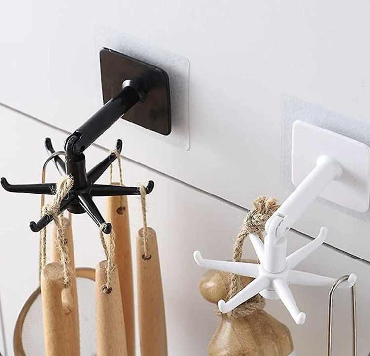 این محصول با استفاده از چسب دو طرفه به سطح دیوار متصل می شود . یک کفی با بازوی ثابت که در قسمت انتهای آن یک بازوی متحرک با قابلیت خم شدن در زاویه 180 درجه دارد . در انتهای این بازو نیز یک آویز با 6 شاخه مجزا قرار گرفته که قابلیت چرخش 360 درجه را دارد . بر روی هر یک از شاخه می توانید ابزاری را به صورت مجزا نظیر کفگیر ، ملاقه ، پوست کن و … آویزان کنید تا در موقع نیاز به سادگی در شعاع دید و همچنین دسترسی شما باشند . بدین ترتیب دیگر نگران برخورد ابزار با یکدیگر که منجر به آسیب دیدن آنها خواهد شد و یا صرف وقت برای گشتن و پیدا کردن آنها نخواهید بود .