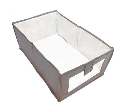 باکس پنجره دار مستطیل می باشد به طوری که سه طرف آن پارچه ساده قرار گرفته و یک طرف باکس حالت توری شکل دارد که باعث شده درون باکس کامل مشخص باشد. قسمت توری باکس گیره ای پارچه ای وصل شده که به وسیله ی آن می توانید باکس را از داخل کمد بیرون بیاورید و مجدد سر جایش بگذارید. می توانید از این باکس برای نظم دهی به شلوار، پیراهن، شال و روسری استفاده کنید. شکل ظاهری آن به گونه ای است که امکان قرار دادن چند باکس کنار یکدیگر وجود دارد و می توانید هر یک از آنها را برای نظم دهی به نوع لباس خاصی استفاده کنید. دیواره های باکس به شکلی طراحی شده که به آن این امکان را بخشیده که به صورت پایدار درون کمد قرار بگیرد.